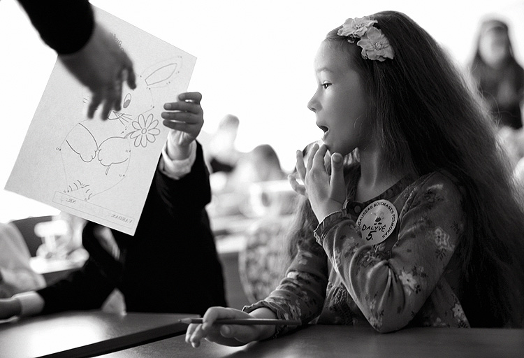 trecia nuotrauka - mokytoja duoda baisaus zuikio paveiksliuka vienai mergaitei, taciau kitai neduoda nieko, nors ji akivaizdziai jo nori - diskriminacija ir korupcija