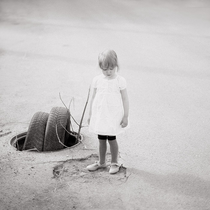 Vis ziuriu i ta nuotrauka ir galvoji, kad ji man patinka. Tas isplaukimas uz mergaites, jos veidukas palinkes, jos kuniukas bejegis, tas stovejimas duobeje lyg kazka pametus, labai viskas gerai susideda. Tik man kliuna ta sakele prie rankos, galetu ji irgi butu buvusi isplaukus. Labai puikus kadras! +5