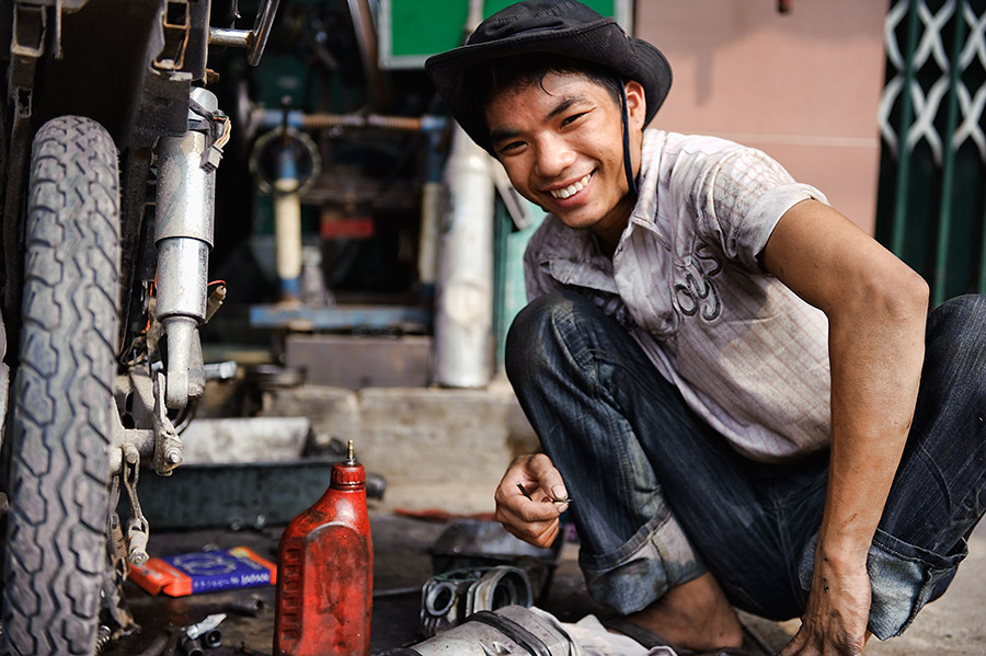 HCMC, Vietnamas, vaikinas, mechanikas, motociklai, gatvė, natūralumas