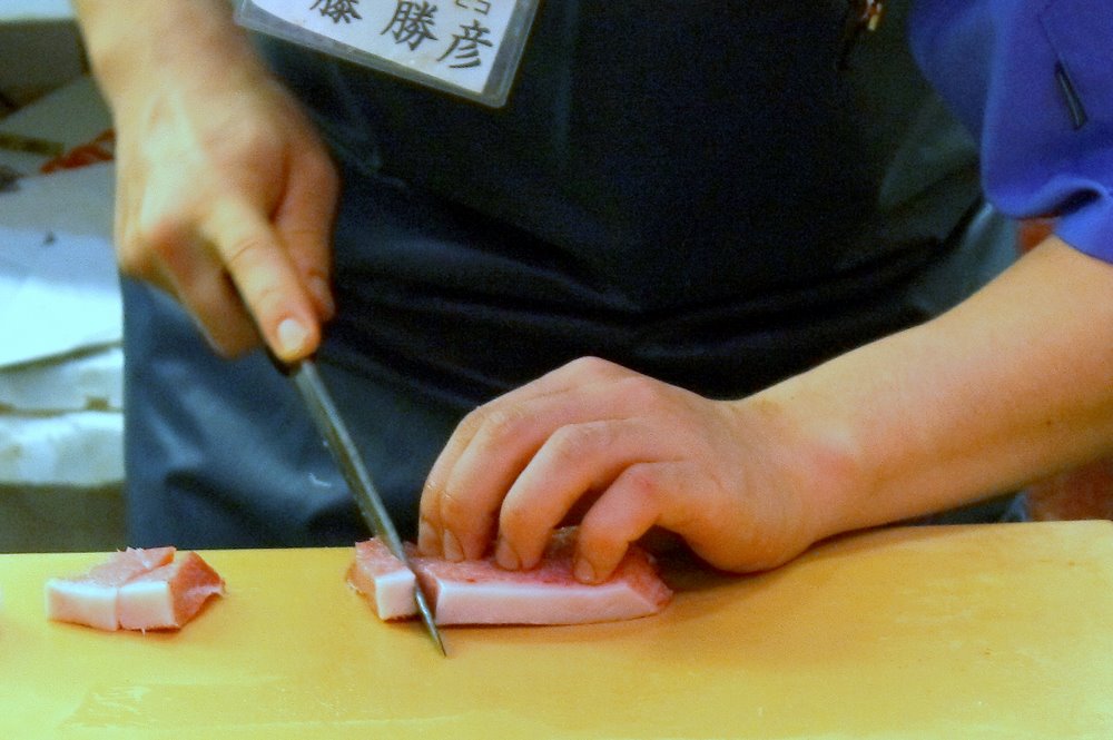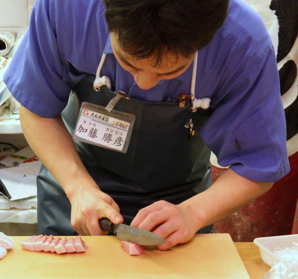 Japonija, Kanazawa, Omicho (Omičo) turgus. Sašimi: skaniausia tuno dalis - maguro toro:) Mmmm...
