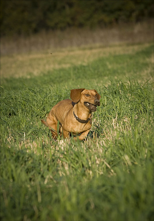 Vidai, taksas fantastiškai fotogeniškas. Pabandyk dar kadravima pataisyti. Suprantu kad fotografuojant tokį spritną šunį nelabai nusitaikysi taisyklingai pakadruoti, bet juk čia skaitmena, ane? Pakadruok photoshopu. :) Bet uz taksa 4,5.