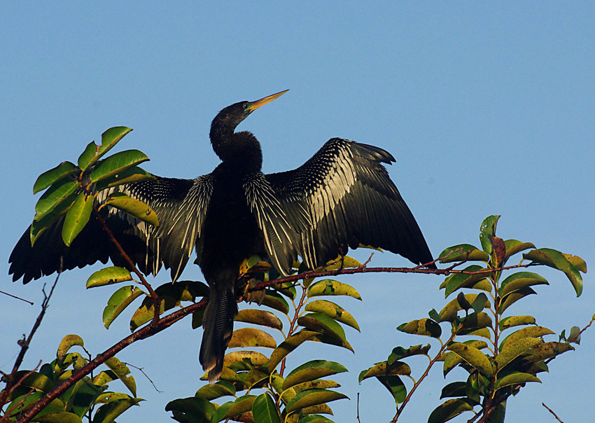 Aninga (Anhingha anhingha) patinas. Šiek tiek panašios į "lieknus" kormoranus. Plaukiant virš vandens kyšo tik kaklas ir galva. Kitaip nei kiti paukščiai, aningos stengiasi ne sučiupti, bet "pasmeigti" žuvį savo aštriu snapu.