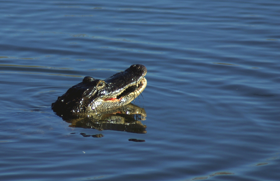 Amerikos aligatorius (Alligator mississippiensis). Sausuoju sezonu daugybės gyvūnų išlikimas priklauso nuo aligatorių suformuojamų gėlo vandens telkinių, ties kuriais ir būriuojasi Floridos žvejai.